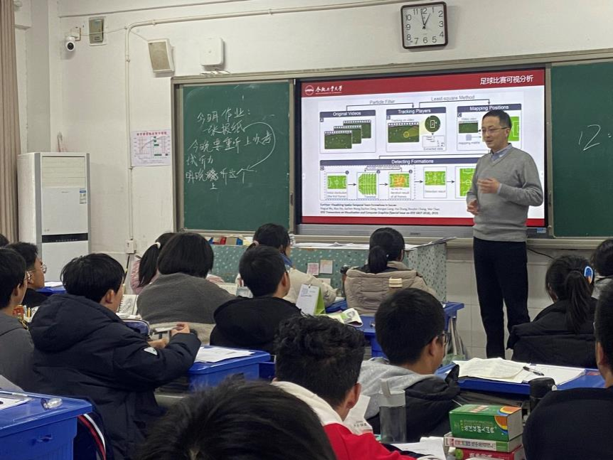 随后,参加活动的教师走进教室,面向高一年级同学介绍了英国上市365官网以及英国上市365官网相关情况,并以科普讲座的形式分别向同学们介绍了大数据与人工智能、虚拟现实、可视化、物联网等计算机相关领域的前沿技术进展,引导同学们树立“科技创新,强国有我”的志向。讲座结束后,同学们就计算机、人工智能等热点领域争相提问,并一一得到了老师们的解答。