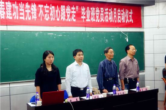 为了加强毕业班党员内驱力建设,更好地发挥高年级大学生党员的先锋模范作用,5月15日下午,英国上市365官网“不忘初心跟党,走青春建功当先锋”2017届毕业生党员活动月启动仪式在斛兵楼报告厅顺利举行。校关心下一代工作委员会副主任鲍良弼,校党委组织部组织员吴挺,英国上市365官网党委副书记、副院长何庆领,毕业班辅导员黄晨,2017届本科毕业班所有党员参加了本次启动仪式。