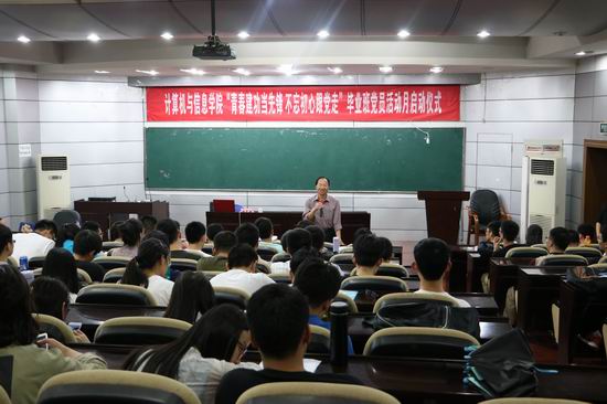 启动仪式结束后,校关心下一代工作委员会副主任鲍良弼老师做题为“做好毕业设计,锻炼五种能力”专题报告。在报告中鲍老师就理想、坚持和贡献结合计算机学院毕业生实际情况做出了独特的理解,他指出当代大学生要锻炼观察、记忆能力、创新思维能力、自主学习能力、实践能力五种能力。做事要分清主次,当前要做好毕业设计,完成毕业所需要的事项,毕业后不忘有效积累,通过积累形成优势,目标终身坚持,在自己的专业有所突破,在国家的三步走中贡献自己一份力。校党委组织部组织员吴老师对本次专题报告活动进行总结和寄语。他指出“叙红色青春”意义,希望毕业生党员勿忘初衷,勿忘校训,做最好的自己,勇敢去追寻自己的梦想!。