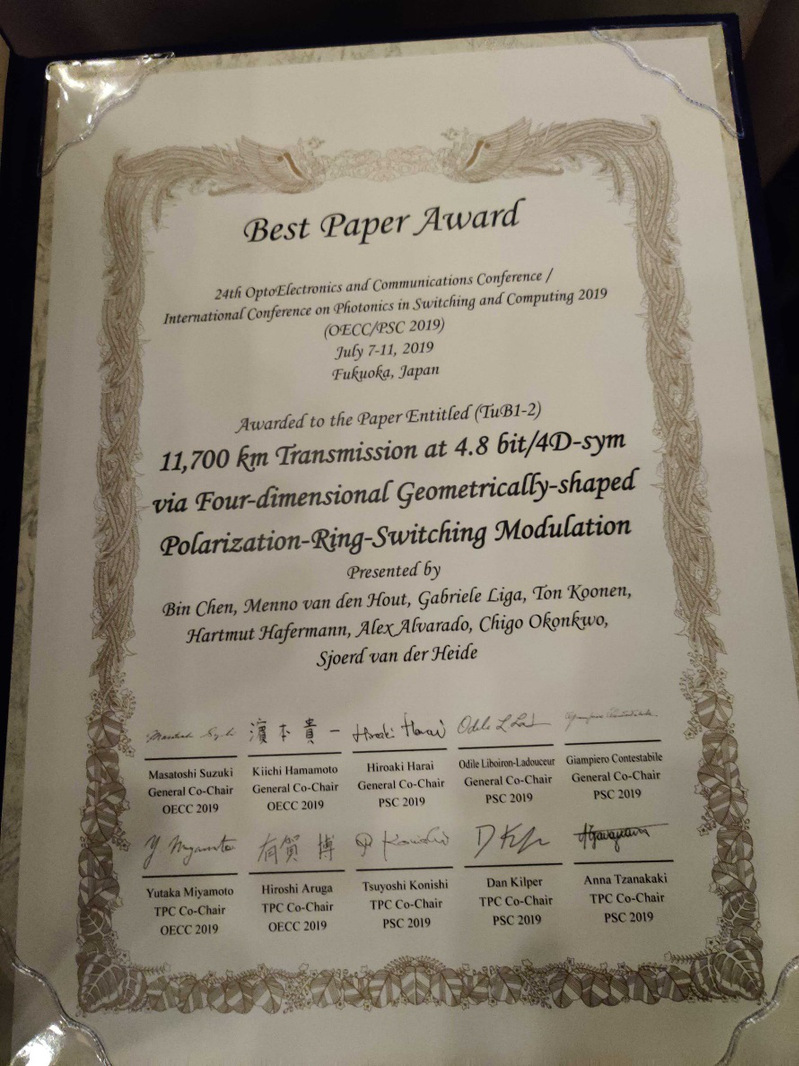 近日,第24届国际光电子和通信会议(OECC2019)在日本召开。365官网陈斌老师的论文“11,700 km Transmission at 4.8bit/4D-sym via Four-dimensional Geometrically-shaped Polarization-Ring-Switching Modulation”获得了本次会议的最高奖项——最佳论文奖(Best Paper Award)。OECC会议是光通信领域最重要、最具影响的国际学术会议之一。