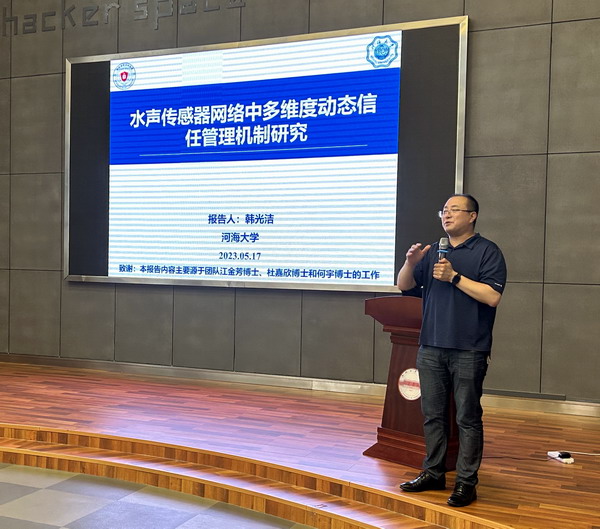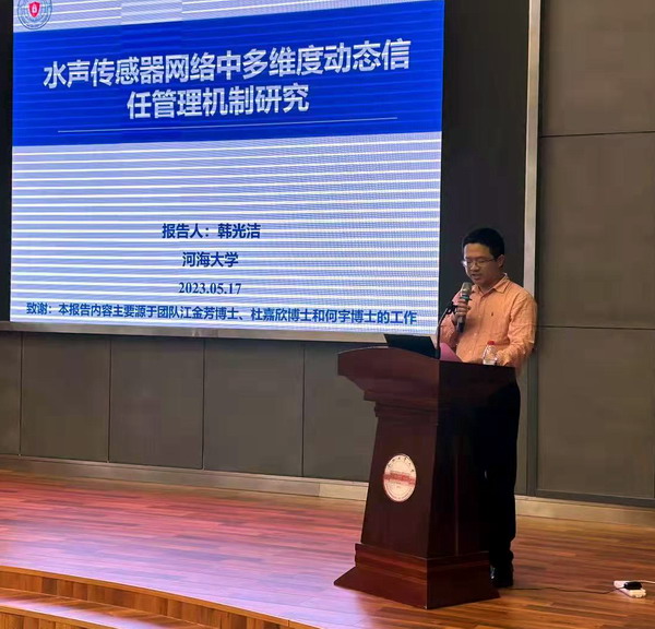 5月17日下午,河海大学韩光洁教授应邀来365官网作题为《水声传感器网络中多维度动态信任管理机制》的专题报告。报告会由学院院长汪萌主持,师生70余人聆听了报告。