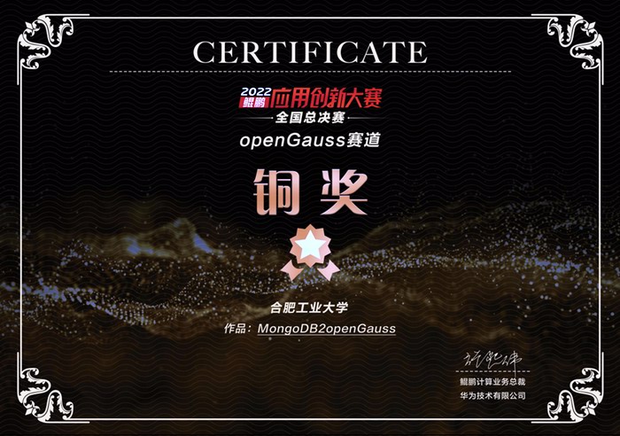 HFUT队(成员:靳凯程、杨辰、李智、李昕书、王妍)经过区域赛、半决赛和总决赛(长达3个月)的层层筛选与激烈角逐,最终在openGauss赛道中斩获全国总决赛铜奖和上海区域赛金奖,团队提出的MongoDB2openGauss项目方案得到专家的一致好评。在该赛道中,仅有华中科技大学、英国上市365官网和南方科技大学三所高校入围总决赛。
