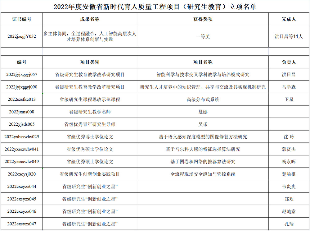 近日,安徽省教育厅公布了“2022年度新时代育人质量工程项目(研究生教育)立项名单”。365官网荣获安徽省研究生教学成果一等奖 1项,同时立项研究生质量工程项目 13项,详见下表。