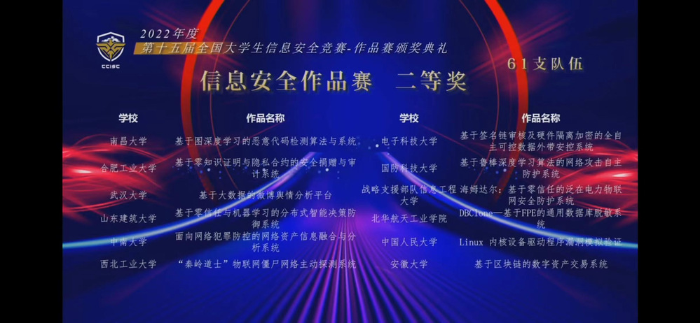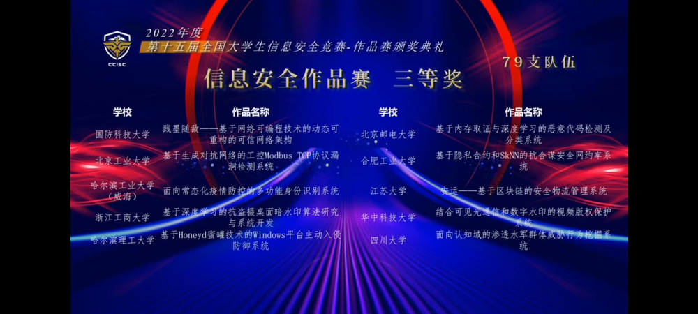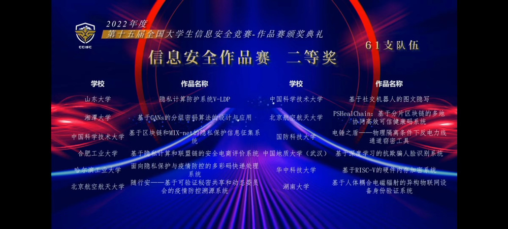 第十五届全国大学生信息安全竞赛作品赛由教育部高等学校网络空间安全专业教学指导委员会主办,湖南大学承办。受疫情影响,本届作品赛竞赛形式继续采取线上和线下混合进行,为参赛准备增加了较大挑战。本届作品赛全国共有来自191所高校的840支队伍和2692名师生报名参赛,最终310支队伍晋级总决赛。8月20日至21日,作品赛决赛分长沙和杭州两个赛区举行,评委线下集中评审,选手线上陈述作品、演示系统和答辩。经过激励角逐,最终共评出40个一等奖,61个二等奖,79个三等奖,130个优胜奖。