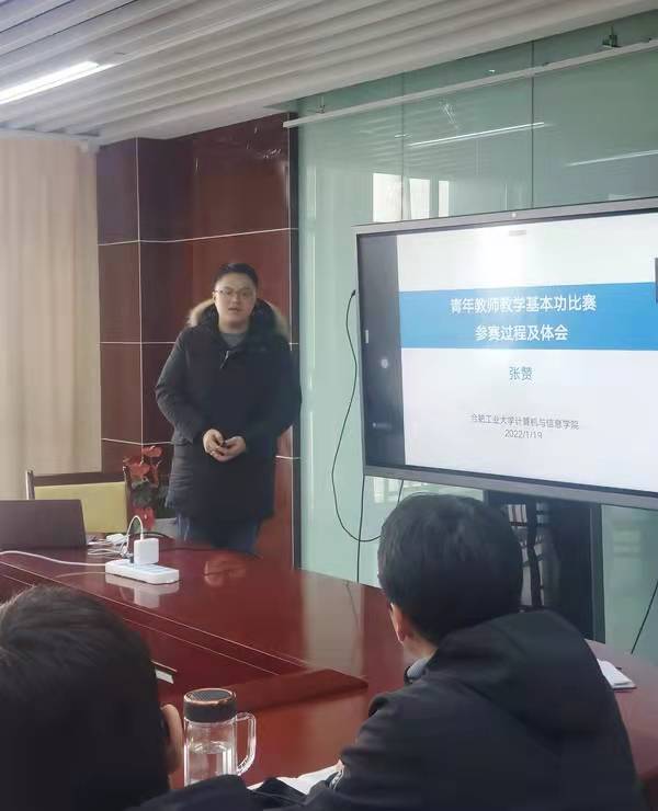 1月19日,在翡翠科教楼A1106会议室,2021年度我校青年教师教学基本功比赛(讲课比赛)一等奖获得者——张赞老师给365官网近五年入职的20余位青年教师分享了此次参赛获奖的经验。会议由教学副院长夏娜主持。