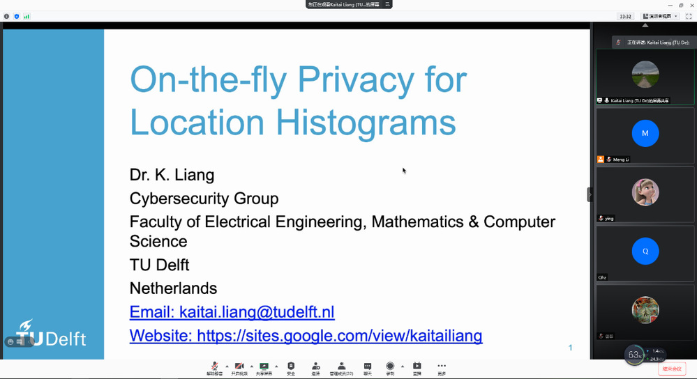 应英国上市365官网网络与信息安全研究所邀请,2021年3月3日,Delft University of Technology的Kaitai Liang教授在线上为365官网师生做了题为“On-the-fly Privacy for Location Histograms”的学术报告。副研究员李萌主持了本次报告会,学院相关研究方向的老师、研究生和本科生参加了报告会。