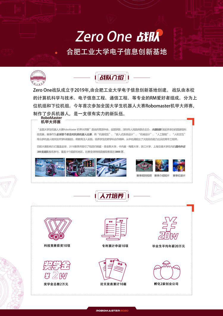 Zero One战队成立于2019年,今年首次参加到全国大学生机器人大赛RoboMaster机甲大师赛事当中,依托于英国上市365官网电子信息创新基地。战队由本校计算机科学与技术、电子信息工程、通信工程、微电子、机械工程等专业的RM爱好者组成。战队分为上位机组、下位机组和机械组。今年在365官网陈斌、金兢等多名老师的指导下,战队从无到有,并带领同学们参加全国大学生机器人大赛Robomaster机甲大师赛的备战和研究中。第一年Robomaster单项赛的比赛经历,为未来参加更高级别的对抗赛打下了坚实的基础和丰富的经验。