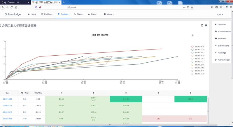 今年的比赛采用在线方式进行,时长3小时,共计5道题目。赛题的解答程序通过网络在线提交,只有通过每题全部测试数据的提交才算有效提交,否则会被罚时,提交程序的正确与否通过网络由判题系统及时反馈给参赛选手。经过3个小时的紧张比赛,共有56名同学提交满足赛题要求的代码。从中评出一等奖6名,二等奖10名,三等奖20名,具体获奖名单见附件1。本次比赛胜出的同学,将有机会代表学校参加2020年安徽省大学生程序设计比赛和国际大学生程序设计比赛(ACM-ICPC)。
