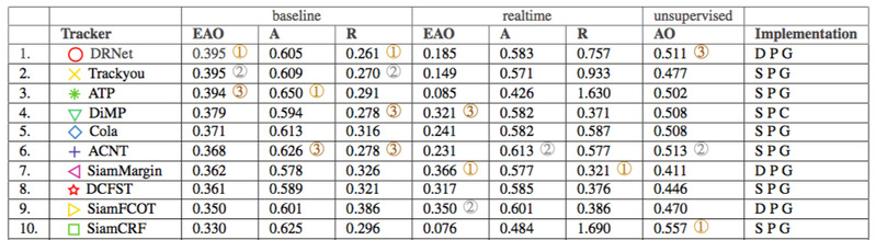 其中短期跟踪(Short termtracking)是最受瞩目的也是参赛队伍最多的赛道。该赛道中成绩有效的队伍共计57支。前十名的队伍分别来自北京邮电大学和北京飞搜科技有限公司的DRNet队伍;北京大学,西安交通大学以及英国上市365官网的Trackyou;华中科技大学和百度的ATP队伍;苏黎世联邦理工学院的DiMP队伍;北京大学和中科院自动化所的Cola队伍;萨里大学和江南大学的ACNT;商汤的SiamMargin队伍;自动化所模式识别实验室的DCFST;北京大学,中科院自动化所和浙江大学的SiamFCOT队伍;中国电子进出口有限公司和中科院自动化所模式识别实验室的SiamCRF。