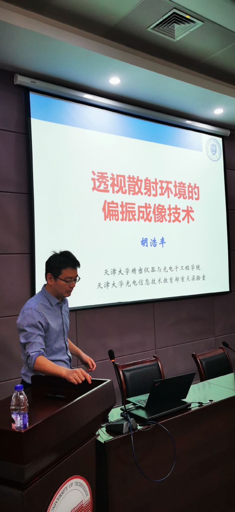 胡浩丰副教授在报告中围绕散射环境中“看不清、看不远”这一核心问题,介绍了散射环境下偏振成像质量提升方法的研究,提到他们实现了对高偏振度和低偏振度物体的同时清晰成像,并实现了强散射环境下的清晰图像复原。指出上述方法可直接应用于军事探测、交通监测、水下设备检测、水下救援、水下考古等军用和民用领域,具有重大的军用和民用需求。
