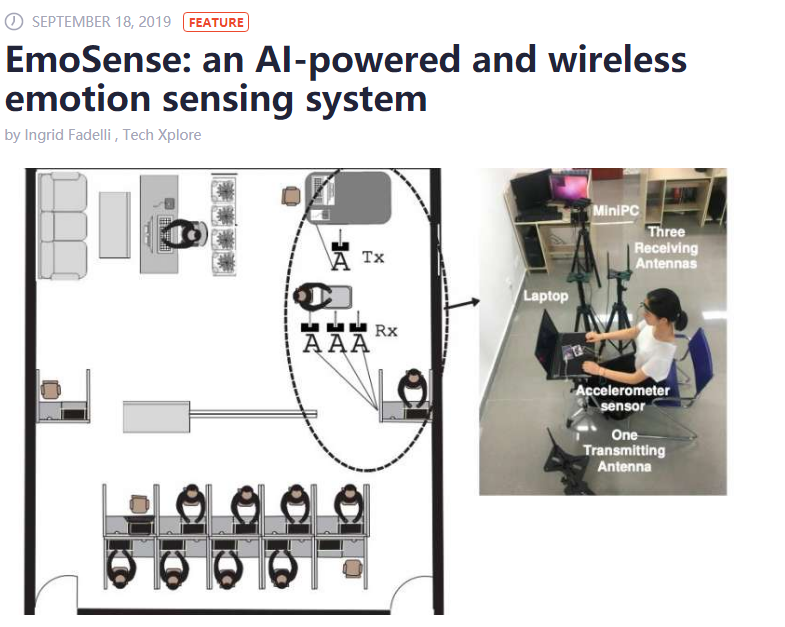 2019年9月18日,Tech Xplore对365官网谷雨教授团队与日本几所大学研究开发的一种基于肢体语言的独特的情绪感知系统——EmoSense做了名为“EmoSense: an AI-powered and wireless emotion sensing system”专题报告。