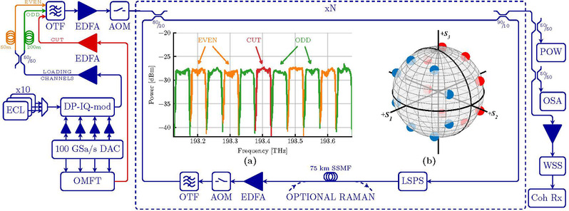 论文基于高速光纤通信传输实验平台,通过波分复用实现了11*200G=2.2Tb/s的高速光通信传输,经过接收端光电信号处理后,无错传输距离可达11,700 km(实验设计和传输平台见图1、图2)。该工作为陈斌在荷兰访问和学习期间同荷兰埃因霍温理工大学(Eindhoven University of Technology)多名教授合作的部分研究成果,该实验结果的前期理论及仿真结果已经以第一作者身份在光通信顶级杂志IEEE/OSAJournal of Lightwave Technology上发表(https://ieeexplore.ieee.org/document/8718568)。本次获奖论文的实验结果进一步验证了该方法的有效性,与传统方法相比,可提升16%的传输距离。