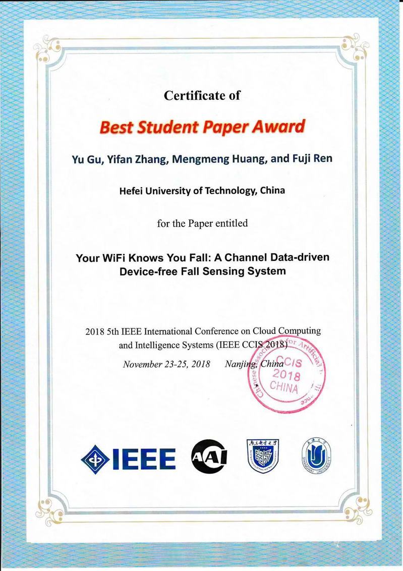 近日,第五届IEEE云计算与智能系统国际会议(IEEE CCIS2018)在南京召开。365官网情感计算与先进智能机器安徽省重点实验室谷雨教授指导的研究生张逸凡、黄濛濛撰写的论文《Your WiFi Knows You Fall: A Channel Data-drivenDevice-free Fall Sensing System》从国内外众多论文中脱颖而出,荣获最佳学生论文奖(Best Student Paper Award)。