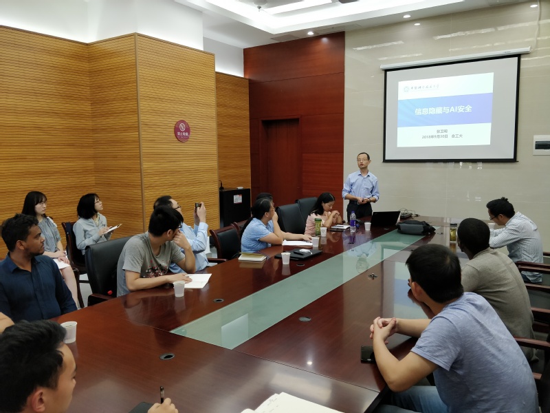 张卫明教授首先回顾了信息隐藏的起源和发展,并介绍了当前具有代表性的工作。张教授指出信息隐藏的技术和应用近年来蓬勃发展,但是缺少类似密码学的坚实理论基础,技术角度的安全不同于理论上的可证安全,借助人工智能技术发展的隐写分析技术,对目前的信息隐藏技术提出巨大挑战。在此基础上,张教授介绍了他所在团队近期开展的工作:通过机器学习算法,构建针对隐写分析网络的对抗样本,误导分类网络做出错误判断,以机器对抗机器,探讨了用机器设计隐藏算法的可能性;从信息论安全和计算安全两个角度出发,阐述了信息隐藏学的可证安全发展思路,并介绍了他团队目前的有关研究工作。最后,张教授梳理了信息隐藏与人工智能相关的发展方向和已开展的工作,并探讨若干开放问题的解决思路。报告会结束后,在座师生就感兴趣的话题和张教授进行了深入交流。