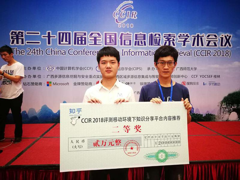 近日,在桂林举行的中国信息检索2018年会(CCIR2018)上,英国上市365官网“媒体与推荐系统实验室(HFUT_MARS)”在由知乎公司、中国计算机学会信息检索专委会(CCIR)、清华大学计算机系联合主办的“移动环境下知识分享平台上的内容推荐竞赛(以下简称知乎在线推荐算法竞赛)”中获得第二名(本次比赛设一等奖1名,二等奖2名,三等奖4名),并受邀在大会上做算法交流报告。