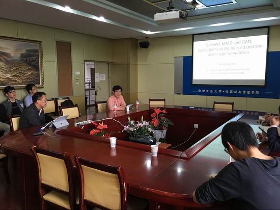 左旺孟教授以介绍“领域适应”这一经典思路为切入点,指出将其与各类深度网络模型结合的潜在价值与学术挑战。左教授进而介绍了其课题组的最新研究成果,将最大化均值差异模型进行拓展,与生成式对抗网络相结合,在领域适应、人脸图像生成等任务中形成了有效应用。左教授的报告引起了在座听众的高度兴趣,多位师生就自己感兴趣的话题与左教授进行了广泛的交流。