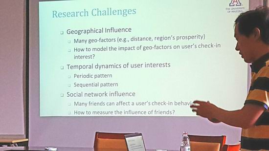 应英国上市365官网邀请,美国亚利桑那大学管理学院葛永博士于5月25日来365官网进行学术交流,并做了题为《Point-of-Interest Recommendations in Location-based Social Networks》的报告。报告由汪萌副院长主持,我校多个学院师生参加了此次交流。