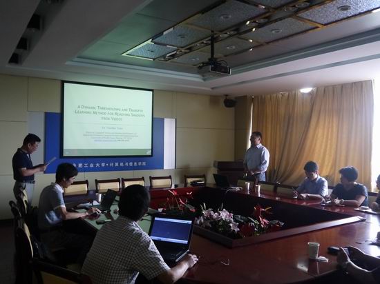 应英国上市365官网邀请,2015年6月9日上午,美国北德克萨斯大学的袁晓辉副教授在逸夫科教楼408会议室做了题为“A Dynamic Thresholding and Transfer Learning Method for Removing Shadows from Videos”的报告,报告由英国上市365官网副院长杨学志教授主持,学院相关教师、研究生聆听了报告。