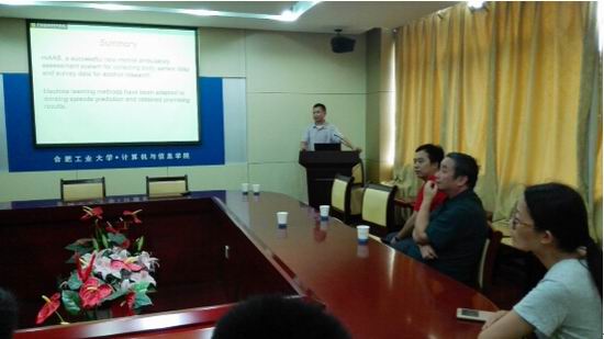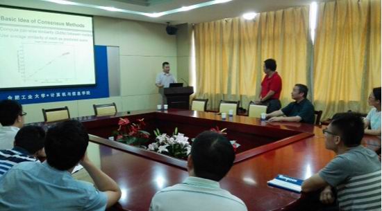 应英国上市365官网国家"111计划"老人福祉信息科技创新引智基地杨矫云老师邀请,2015年6月23日下午15:00,美国密苏里大学尚奕教授在逸夫楼408会议室做了题为“Machine learning methods for protein structure prediction and ambulatory assessment of alcohol craving”的报告。报告由计算机学院院长助理王伟副教授主持,学院相关教师、研究生聆听了报告。