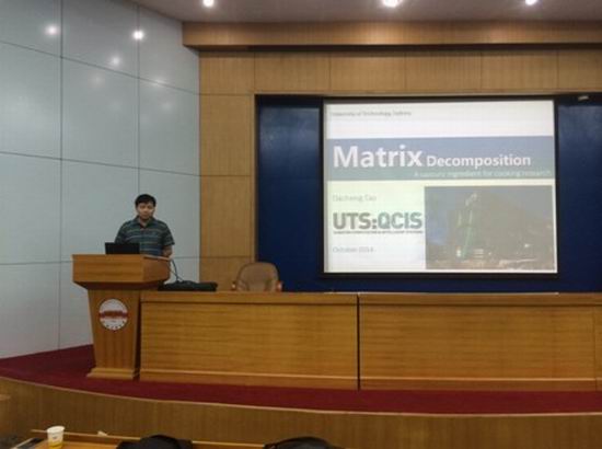 10月21日上午,应英国上市365官网的邀请,澳大利亚悉尼科技大学陶大成教授在我校学术报告厅进行题为“Matrix Decomposition - A savoury ingredient for cooking your research”的学术专题报告。报告由365官网“黄山学者特聘教授”汪萌教授主持,学院相关研究方向教师、以及对该方向具有浓厚兴趣的众多研究生与本科生踊跃参加了此次报告会。
