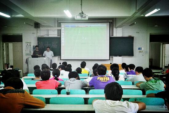 在仿真3D组决赛中,来自合肥校区和宣传校区的9支代表队展开激烈的争夺,信息工程系hfut-3q队与信息工程系蜗牛队从众多队伍中脱颖而出,进行3D组决赛冠军的比拼,在场同学仿佛置身于足球场中观看一场真正的足球赛,并为自己支持的机器人足球队呐喊助威,经过顽强比拼,hfut-3q队以2:1险胜蜗牛队,摘得此次仿真3D组比赛桂冠。