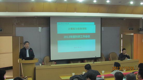 杨学志副院长首先通报了我校下半年工作布置会议的精神及学院工作的开展情况,接着通报了365官网科研工作情况,介绍了本年度科研经费目标任务及完成比例,2013年度国家自然科学基金申报及获批情况,以及365官网在人才项目、团队项目和基地项目上取得的突破性进展,并从学科发展的角度提出进一步凝练核心研究方向,加强人才队伍和基地建设。最后就学校出台的科研经费方面一系列新政策进行了解读。