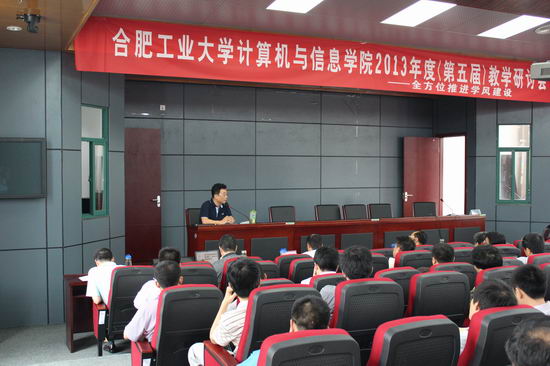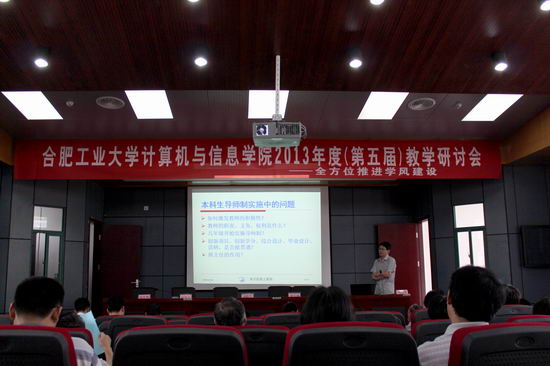 7日是研究生教学专场研讨。上午,首先,副院长杨学志教授做了2012-2013学年研究生工作总结,对本次研究生招生情况、本学年研究生获奖情况、集中答辩、研究生分配导师等进行了细致的介绍,用丰富的数据进行了说明。随后,计算机系系主任路强副教授就计算机科学与技术专业研究生自主命题方案进行了介绍。下午,各系分组围绕研究生课程设置的修改、研究生分配规则、国家奖学金评定方法、硕士论文质量排序规则、集中答辩实施方法进行了讨论。分组期间,大家畅所欲言,讨论热烈,就很多教学、科研问题展开研讨,最后提出了若干种可能的解决方案。