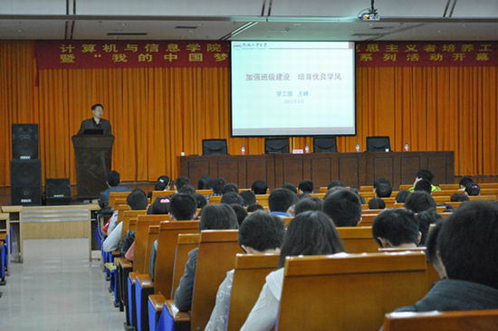 随后,王峰部长面对广大同学进行了一场名为《加强班级建设,培育优良学风》的报告,报告中指出大学加强学风建设对实现民族伟大复兴 “中国梦”的重要意义。王峰部长在总结我校2012年学风建设的主要成效和不足后就班级建设、寝室建设、学业指导、帮扶机制等10方面对广大学生提出要求,期望广大同学加强自我约束和自身建设,严于律己,在学习、工作、生活等方面争做一名优秀的当代大学生。