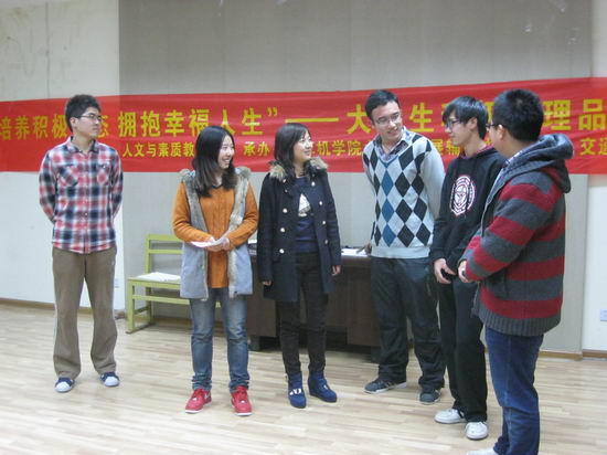 此次训练营共开展了 “积极心态 幸福人生”理论学习、“新起点•心方向”大学生涯规划 、“培养积极心态、拥抱幸福人生”团体辅导、“胶片中的别样人生”积极心理学影片赏析四个单元活动。通过初期的广泛宣传及面谈筛选,最终组成了这支由不同学院的同学构成的队伍。