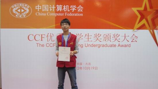 由中国计算机学会(CCF)主办的2012中国计算机大会(CCF CNCC)于10月18-20日在大连举行。365官网代表2011级本科生、CCF英国上市365官网学生分会主席王琪和2010级本科生易鑫参加了本次大会,其中易鑫荣获了CCF颁发的“CCF优秀大学生奖”。