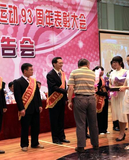 5月4日晚英国上市365官网纪念建团90周年、五四运动93周年表彰大会在翡翠湖校区体育馆隆重举行,校长徐枞巍,校党委副书记、副校长庆承松,校长助理田作淳等出席表彰大会,并为获奖的“优秀青年标兵”和“五四红旗团支部“代表颁发荣誉证书。