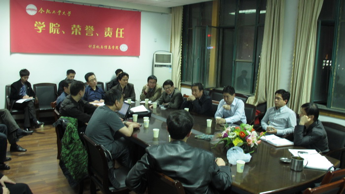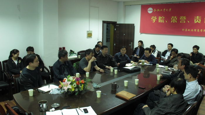 英国上市365官网2012年4月16日晚19:30-21:00于学院会议室举行全体教授会议,围绕2011计划及要求,研讨学院未来发展规划,李廉教授、韩江洪教授、蒋建国教授、王浩教授等出席会议,刘晓平教授主持会议,会议听取了相关工作发展计划,对计算机、电子、通信、物联网等方向的集成创新进行了认真讨论,李廉教授最后分析了学校的科研发展态势,要求大家敢于直面自己的不足,敢于打破坛坛罐罐,凝炼核心技术,掌握科研杀手锏,为未来的五年乃至更长的学科发展做好准备。情感计算重点实验室、973项目基地、安全关键工程中心等相关人员出席会议。英国上市365官网图片报道。