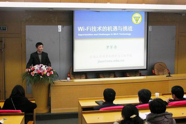 报告会上,罗军舟教授主要从四个方面详细介绍了Wi-Fi技术的蓬勃发展和研究趋势,分别是:Internet发展趋势,Wi-Fi技术现状,Wi-Fi基站原理和原型系统以及Mesh网络性能优化。其中针对Wi-Fi的技术现状,从Wi-Fi联盟和Wi-Fi技术优势到Wi-Fi的标准化进程再到Wi-Fi移动网络构建过程进行深入介绍。随后,介绍了与中兴通讯公司合作完成的江苏省科技成果转化专项资金项目 “支持IP移动的WLAN基站及其核心网络设备产业化”的基本构架和完成成果,激发了在做同学和老师的极大兴趣。在互动环节,参会者踊跃提问与发言,咨询了很多有关Wi-Fi方面的问题,罗教授也耐心详尽为同学们答疑解惑。会后,仍有很多学生意犹未尽围着罗教授探讨相关的问题,整场大会在浓浓的学术氛围中结束。