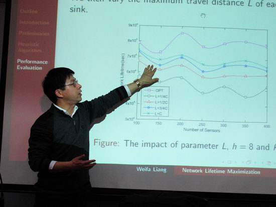 应英国上市365官网邀请,澳大利亚澳洲国立大学(Australian National University)计算机科学系梁维发教授于2011年12月13日来365官网进行为期一天的学术活动。下午15:30,梁维发教授在校学术活动中心二楼小报告厅为365官网与安全关键工业测控技术教育部工程研究中心的师生作了题为“Network Lifetime Maximization in Sensor Networks with Multiple Mobile Sinks”的学术报告。报告由刘晓平院长主持,学院和工程中心的相关教师、研究生和本科生参加并聆听了报告。