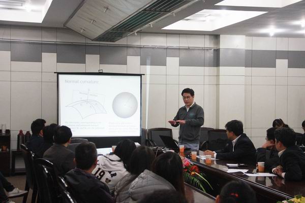 伯彭波博士在报告中简要说明了自由曲线建模(Freeform Surface Modeling)和曲率(Normal Curvation)等的概念,然后详细介绍了其提出的Dupin Cyclide方法,对Cyclide Patches的几何性质作了细致的分析,并与现有的Frame Propagation方法进行了对比。最后,伯彭波博士介绍了其在模型优化方面所做的工作,展示了多个实例并指出了其在建筑行业中的应用。伯彭波博士的报告引起了在座师生的浓厚的兴趣,分别就自己感兴趣的问题与伯博士进行了热烈地探讨。
