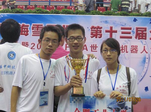“林海雪原杯”第十三届全国机器人锦标赛暨2011年FIRA世界杯机器人大赛中国队选拔赛于7月24日-26日再在黑龙江省牡丹江市举行,来自北京大学、哈尔滨工业大学、华中科技大学、北京理工大学、四川大学等52所高校的500多名师生参加了该项赛事。我校HfutEngine代表队在王浩教授、方宝富老师带领下参加比赛,8名“引擎”仿人机器人在4名参赛队员精心调试下,经过顽强拼搏分别获得类人型阶梯跑比赛季军,获得类人型单人、双人舞蹈、类人型点球二等奖,获得类人型短跑、类人型1VS1击剑、类人型1vs1拳击、广播体操三等奖。中央电视台对我校队员羊志琼同学进行了采访。