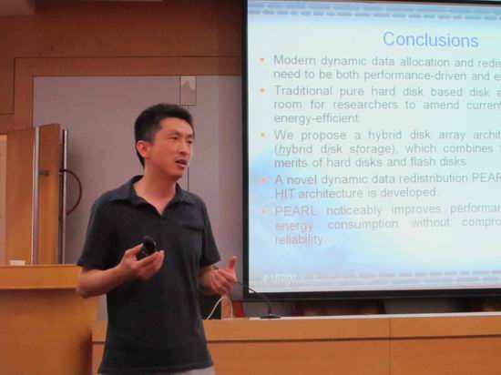 谢涛博士从性能、能量和可靠性等多个角度对现代动态数据分配和再分配技术进行了全面地阐述,针对传统技术追求高性能而忽略能量的问题,分析了现有动态数据分配算法的优势和劣势,提出了一种综合考虑性能和能量的HIT(hybrid disk storage)磁盘阵列架构,并在HIT架构上建立了一种新颖的动态数据再分配算法PEARL,从而能够提高性能和降低能量,并且又不损害flash disk的可靠性。报告见解独特、分析深刻生动,激起参会人员的强烈兴趣与互动,最后在全场热烈的掌声中结束此次报告。