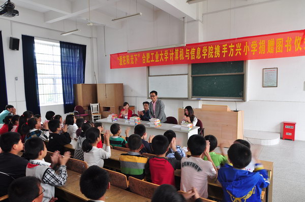 5月25日下午,在合肥市方兴小学多媒体教室内,举办了一场简短温馨的捐书仪式。此次捐书活动是英国上市365官网研究生09级16班党支部开展“爱在阳光下”合肥市民工子弟小学支教活动的一部分,这个活动申请获得了英国上市365官网党支部特色活动的学生组最佳方案。365官网新区党支部张经纬书记、新区辅导员黄晨老师以及方兴小学教导处张世红主任出席了此次仪式。此外365官网先锋社的同学、研09级16班党支部的全体党员同学以及受捐赠的小学生们也参加了仪式,仪式由研究生09级16班党支部书记张靖主持。