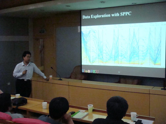 在学术会议中心,袁晓如博士为365官网师生作了题为“高维数据可视化与交互分析研究”的学术报告。刘晓平教授主持报告,刘雨副秘书长和学院相关教师、研究生出席了报告会。报告从如何通过引入信息可视化和人机交互的新手段分析处理复杂科学数据,构建人与数据沟通的桥梁开始,介绍了复杂高维时空数据可视分析技术,并通过案例介绍了可视化分析在大气模拟数据、地震目录数据、交通轨迹数据、生物医疗数据等领域的应用。报告会上,师生提问踊跃,气氛热烈,袁晓如博士的精彩回答博得了全场的阵阵掌声。 报告会后,袁晓如博士和刘雨秘书长参观了计算机应用技术研究所,并进行了交流。