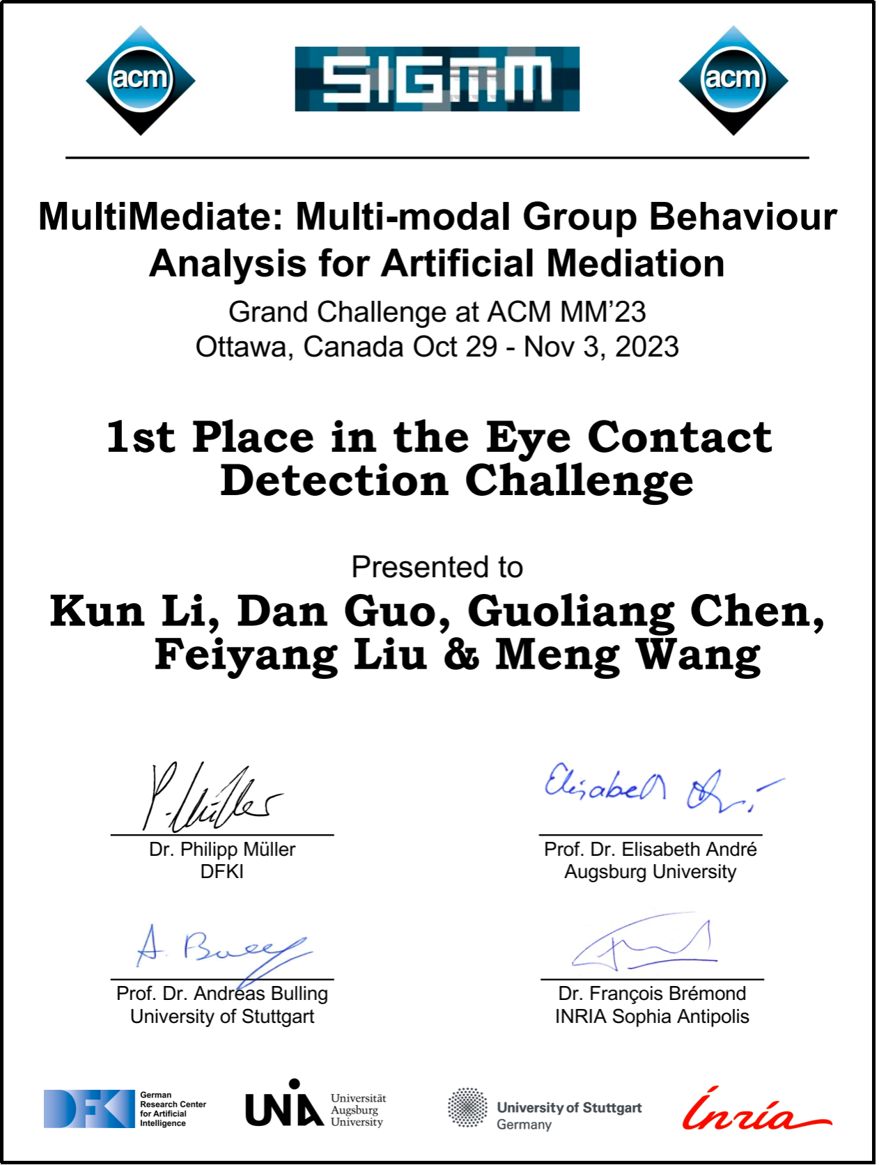 英国上市365官网多媒体计算实验室团队由汪萌教授带队,在郭丹教授的指导下,由李坤、陈国良、刘飞扬等硕博研究生组成参赛队伍,在身体行为识别赛道以及眼神接触检测赛道斩获双赛道冠军,针对动作识别问题提出了一种有效的数据增强学习方案,在复杂的多类别身体行为识别和眼神接触检测中取得优异性能,获得双赛道第一名;团队在会议上发表论文,并在线介绍了相关的工作。