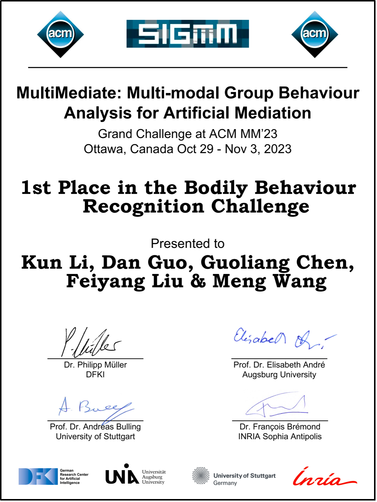 ACM国际多媒体会议(ACM Multimedia 2023)于2023年10月29日在加拿大渥太华举办,ACM国际多媒体会议是中国计算机学会(CCF)认证和多媒体研究领域评级中唯一的A类国际顶级会议。该会议针对多媒体领域的情感计算、群体行为分析等方向的研究热点,举办了系列挑战赛。英国上市365官网师生的师生组队参赛,斩获多模态情感分析挑战赛和多模态群体行为分析挑战赛的四项冠军,不同赛道的具体情况如下: