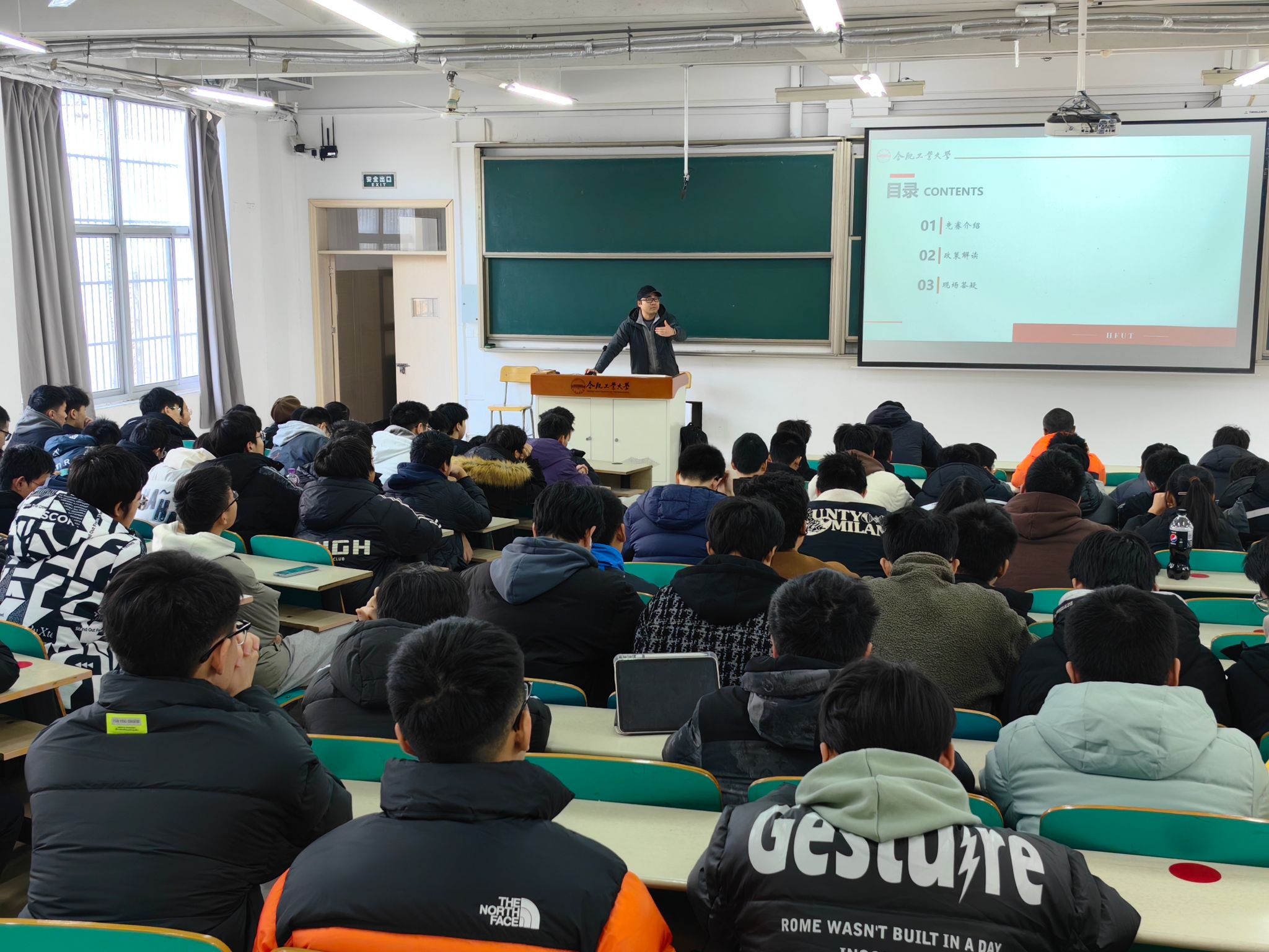 活动中,金兢结合同学们非常关心的中国国际大学生创新创业大赛、挑战杯、全国大学生电子商务“创新、创意及创业”挑战赛、全国大学生电子设计竞赛、全国大学生智能汽车竞赛、安徽省机器人大赛等9项与专业密切相关的比赛,详细介绍了比赛的背景、组织架构、开展时间、奖项设置、前期准备、知识要求、能力要求等内容,鼓励同学们掌握扎实的专业知识,明确比赛要求,以赛促学、以赛促练,带动综合素质的全面提升。他还结合学校相关文件,向大家介绍了创新创业竞赛以及学术加分规则,帮助同学们熟悉相关政策。互动环节,同学们积极提问,金老师耐心解答,鼓励同学们利用寒假时间,查阅资料和文献,探索感兴趣的方向,及早投入到科研竞赛活动中。活动结束后,同学们纷纷表示讲座干货满满,专业相关度高,对今后参加比赛具有很大的帮助。