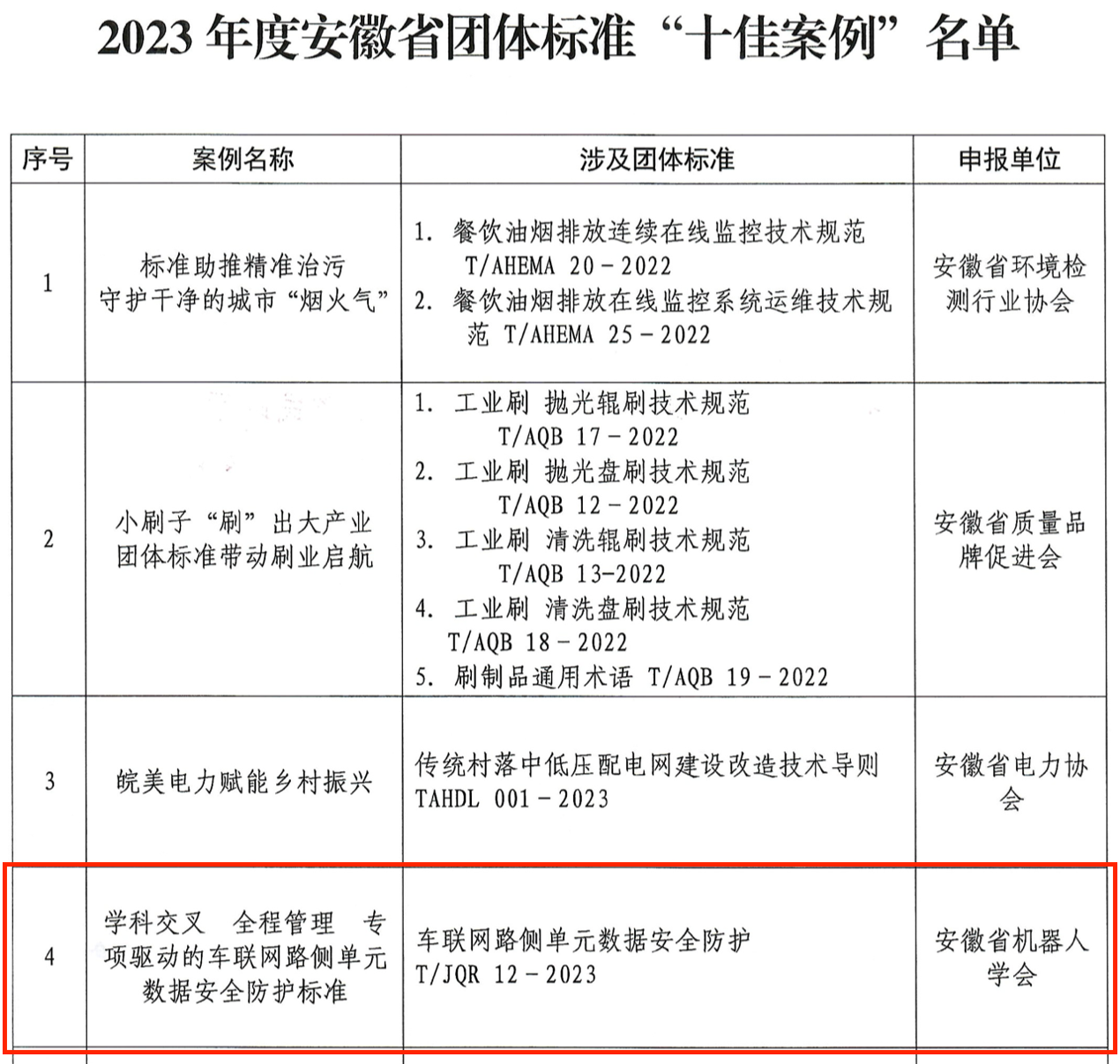 近日,安徽省市场监督管理局、安徽省民政厅联合印发《关于公布2023年度安徽省团体标准典型案例的通知》(皖市监函〔2024〕298号)。英国上市365官网胡东辉教授团队依托安徽省机器人学会申报的团体标准(T/JQR 12-2023,车联网路侧单元数据安全防护)荣获2023年度安徽省团体标准典型案例中的“十佳案例”。