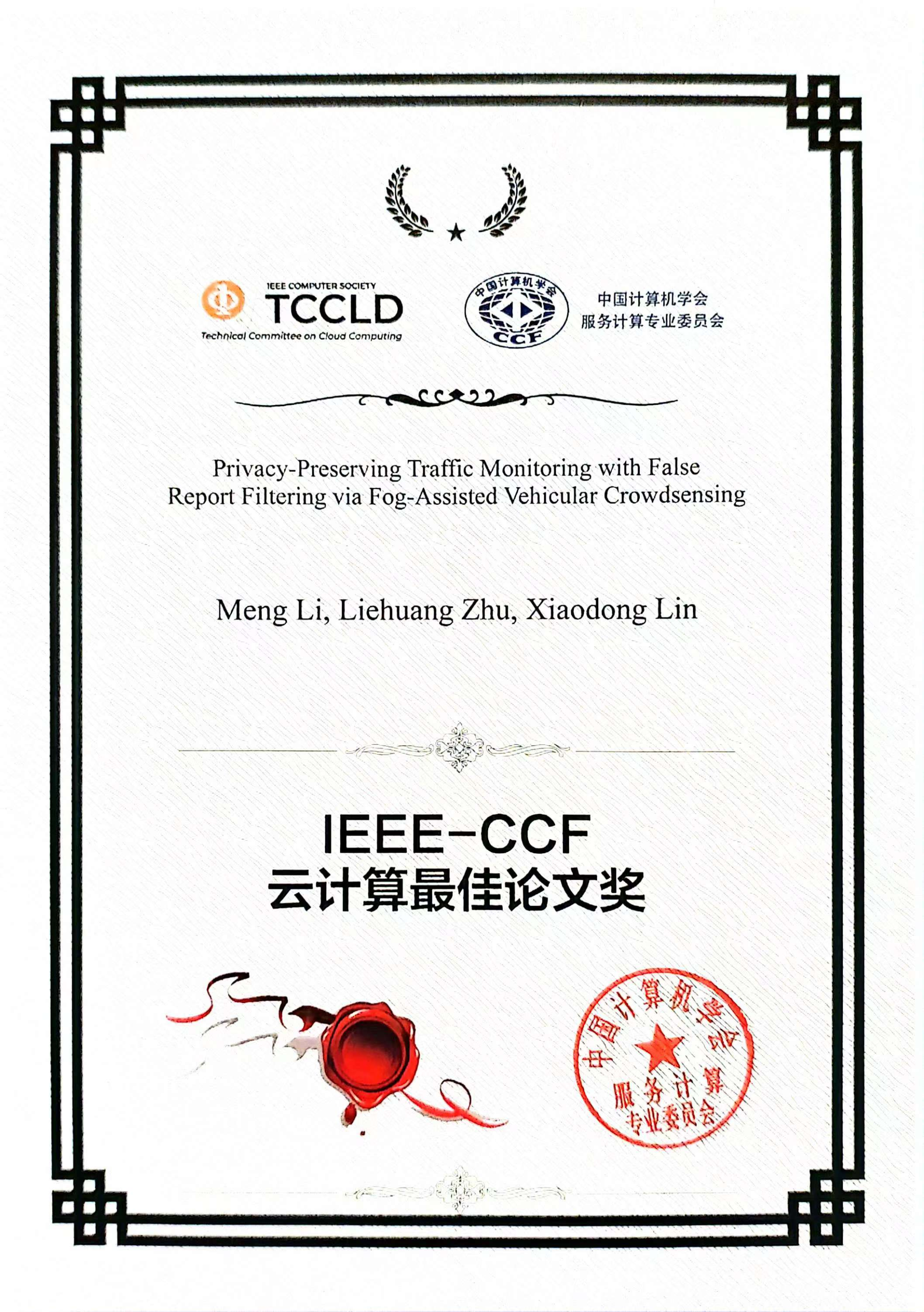 365官网李萌副研究员带领的泛在隐私实验室近年面向车联网和云计算,在数据安全和隐私保护研究方向开展深入研究,取得了系列研究成果。其中一个成果的论文“Privacy-Preserving Traffic Monitoring with False Report Filtering via Fog-assisted Vehicular Crowdsensing”,发表在CCF A类推荐期刊IEEE TSC(IEEE Transactions on Services Computing)上,并在2024年9月13日获得IEEE-CCF云计算最佳论文奖。该研究成果是和北京理工大学、圭尔夫大学合作,基于密码学、云计算和边缘计算,帮助解决车联网交通监测场景中安全过滤虚假路况信息的问题。