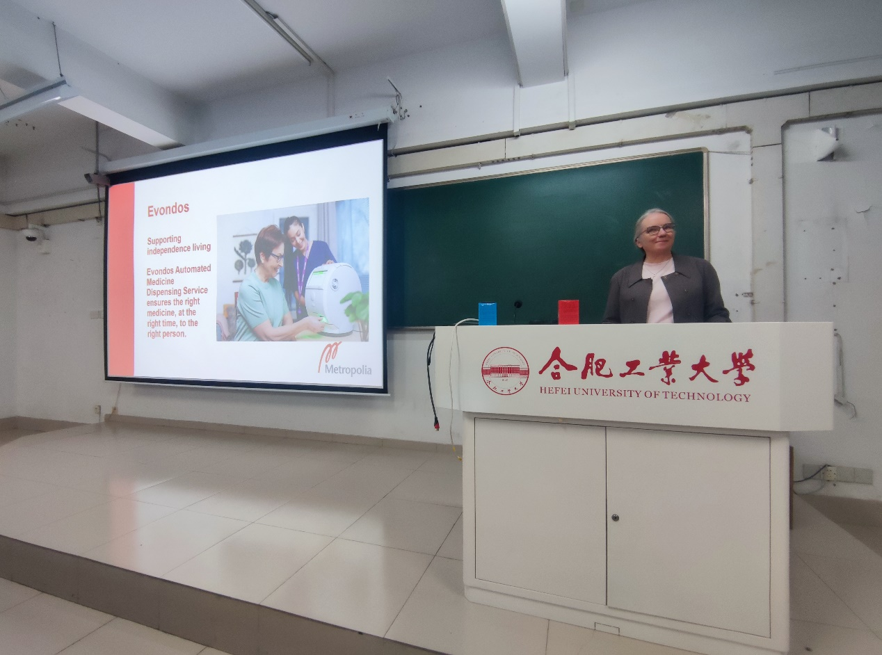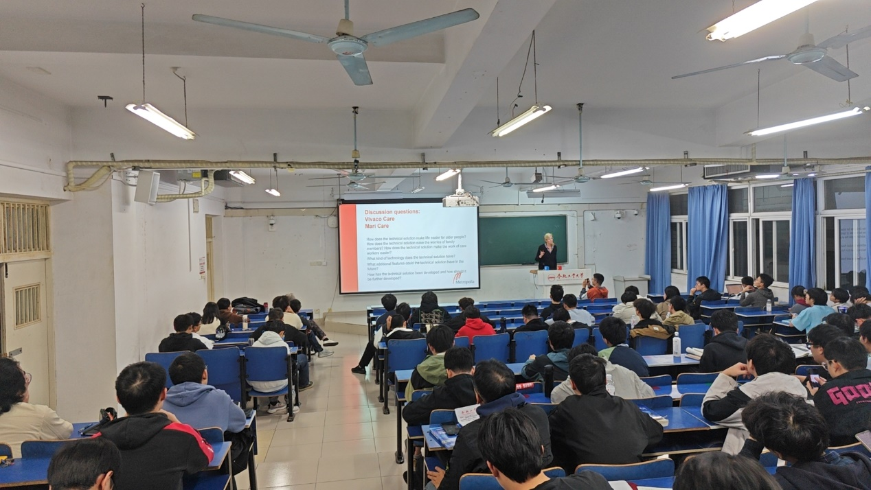 课堂上,Päivi Haho博士介绍了Evondos自动化药物分发系统和Suvanto Care远程安全监测系统,展示了这些智能养老产品在保障老年人用药安全和居家护理方面的应用成效。Pirjo Vesa博士则讲解了Vivaco Care智能护理系统和MariCare智能检测系统,这些技术可以实现跌倒预防、行为监测及全天候安全报警,显著提升了养老服务的质量。通过实际案例,学生们学习了如何利用智能机器人、健康监测传感器和非穿戴式检测系统等先进技术来提升老年人的生活独立性和安全性。课上,学生们还与两位教授就Evondos系统的使用感受以及智慧养老领域的未来发展进行了积极讨论。