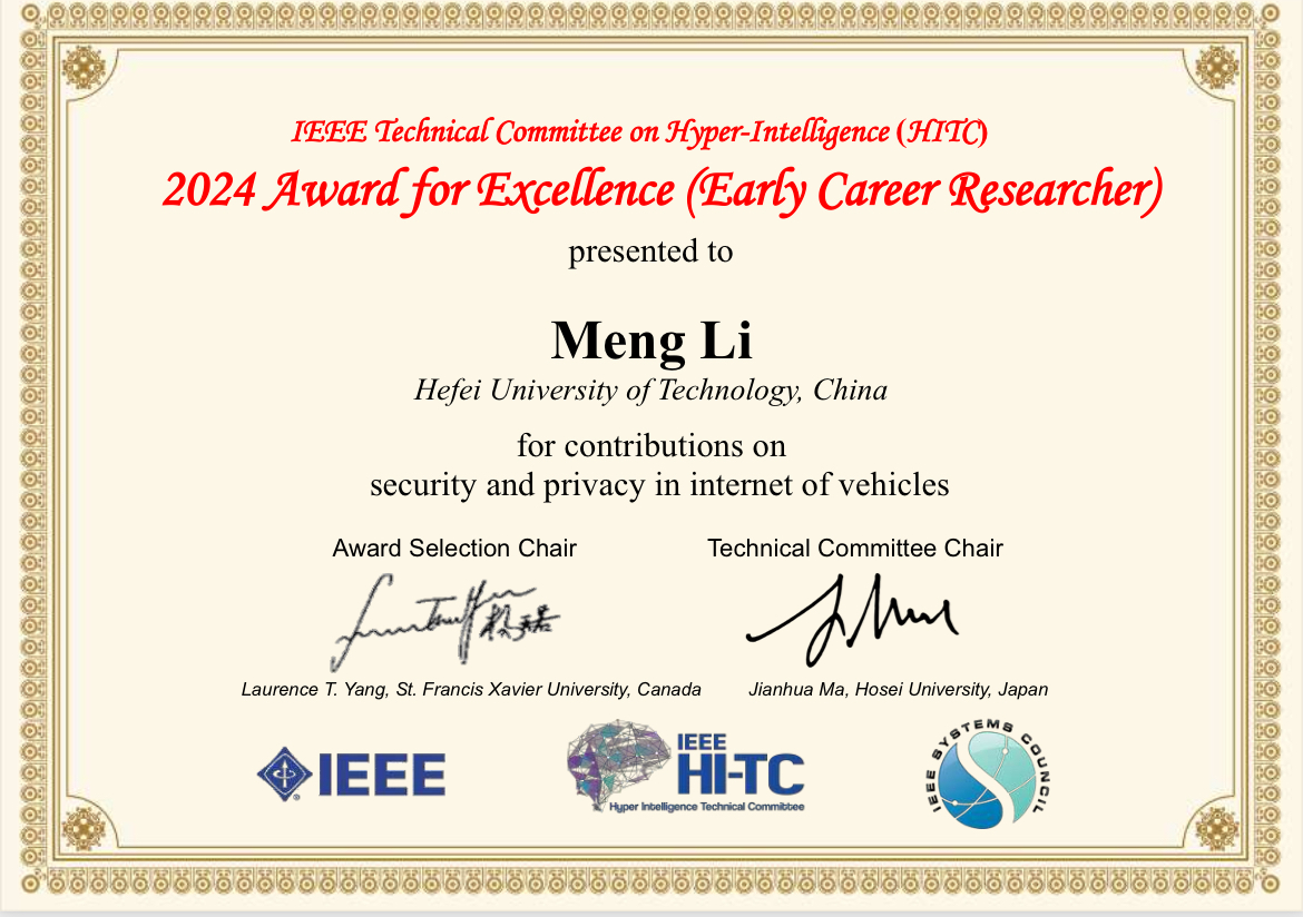 日前,据来自IEEE超智能专业委员会(IEEEHyper-IntelligenceTechnical Committee,HITC)的最新消息,365官网李萌副研究员荣获2024年IEEE HITC“早期职业成就奖”(IEEE HITC Award for Excellence for Early Career Researchers)。这也是365官网青年学者首次获此殊荣,显示了365官网网络空间安全学科方向青年教师在国际学术界日益提升的影响力。