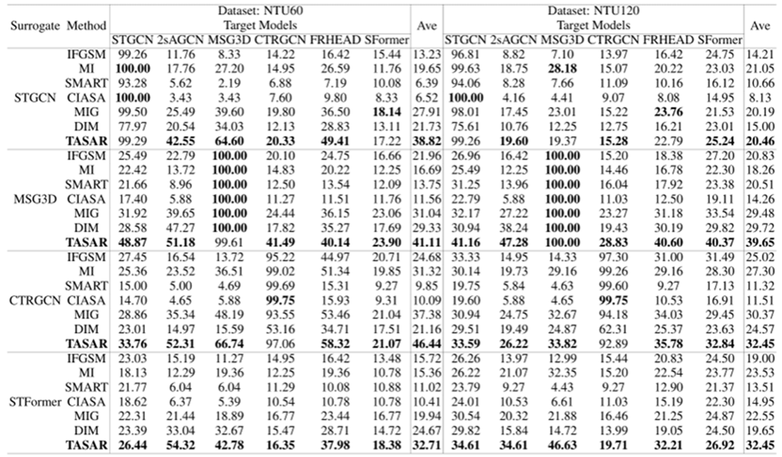Table 1: The attack success rate(%) of untargeted transfer-based attacks on NTU60 and NTU120. ’Ave’ was calculated as the average transfer success rate over all target models except for the surrogate.’SFormer’ represents SkateFormer and MI stands for MI-FGSM.